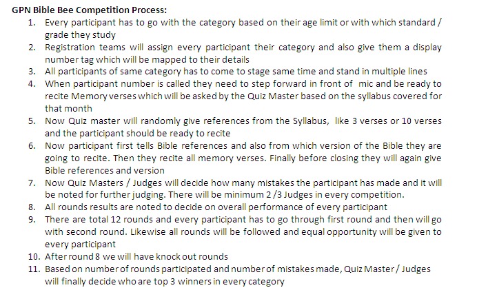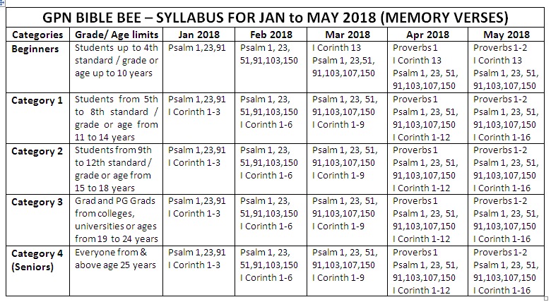 We need to memorize every verse from Chapters given above. Program Organizers will advise on details of chapters to be covered every month for Competition while registering for GPN Bible Bee